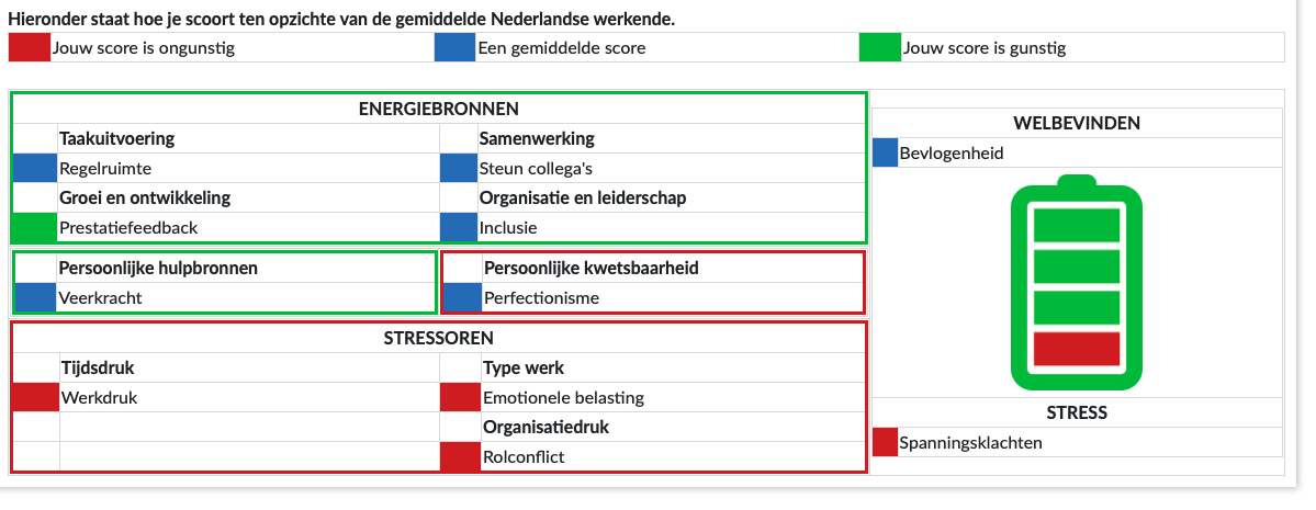 De resultaten worden in een samenvatting teruggegeven. Zo heeft de respondent in 1 overzicht staan waar gunstig en ongunstig op wordt gescoord.
